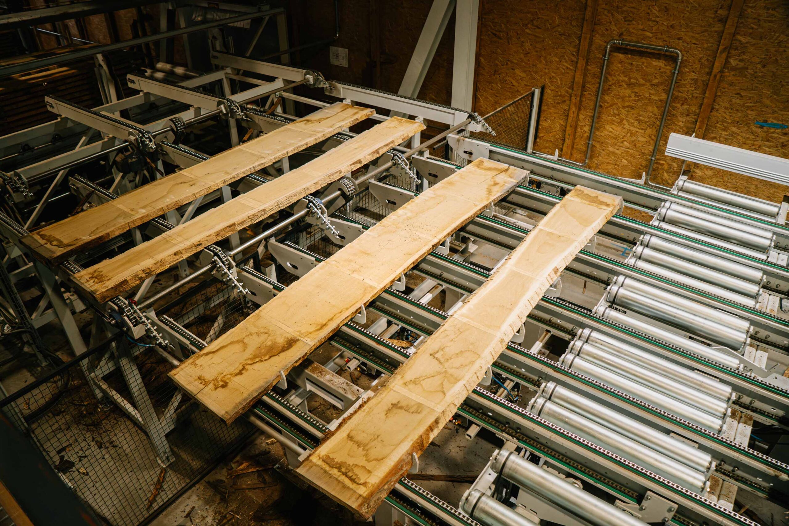 In Zusammenarbeit mit einem Maschinen- und Anlagenbauer haben wir unsere Säum- und Kantelanlage entwickelt. Wir wussten, was wir wollten und so schufen fundiertes Fachwissen der Ingenieure und unsere Erfahrung eine zukunftsweisende, weitgehend automatisierte Säum- und Kantelanlage, die die größtmöglichen Längen und Breiten aus den Schnittbrettern schneidet. Laser und EDV unterstützen die Mitarbeiter in ihrer Arbeit. Die abgesäumten Baumkanten werden aufgefangen, auf Ofenlänge gekürzt und als Brennholz verkauft und die Sägespäne finden ebenso ihren Weg in den Markt als Holzbrikett.
