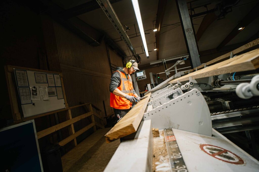 In Zusammenarbeit mit einem Maschinen- und Anlagenbauer haben wir unsere Säum- und Kantelanlage entwickelt. Wir wussten, was wir wollten und so schufen fundiertes Fachwissen der Ingenieure und unsere Erfahrung eine zukunftsweisende, weitgehend automatisierte Säum- und Kantelanlage, die die größtmöglichen Längen und Breiten aus dem unbesäumten Schnittholz schneidet. Laser und EDV unterstützen die Mitarbeiter in ihrer Arbeit. Die abgesäumten Baumkanten werden aufgefangen, auf Ofenlänge gekürzt und als Brennholz verkauft und die Sägespäne finden ebenso ihren Weg in den Markt als Holzbrikett.