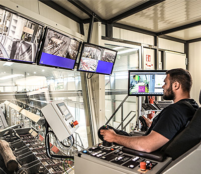 Hier gibt es High-Tech und einen Arbeitsplatz mit Gaming-Faktor. Laser- und Computergesteuert wird der Baumstamm vermessen und optimal mit minimalem Verlust geschnitten. Die moderne Blockbandsäge wird vom Cockpit aus geführt. Sie sägt mit 17 Grad Neigung im Vor- und Rückschritt. Auf den Ein-Schichtbetrieb gerechnet, schafft sie pro Jahr ca. 20.000 fm.