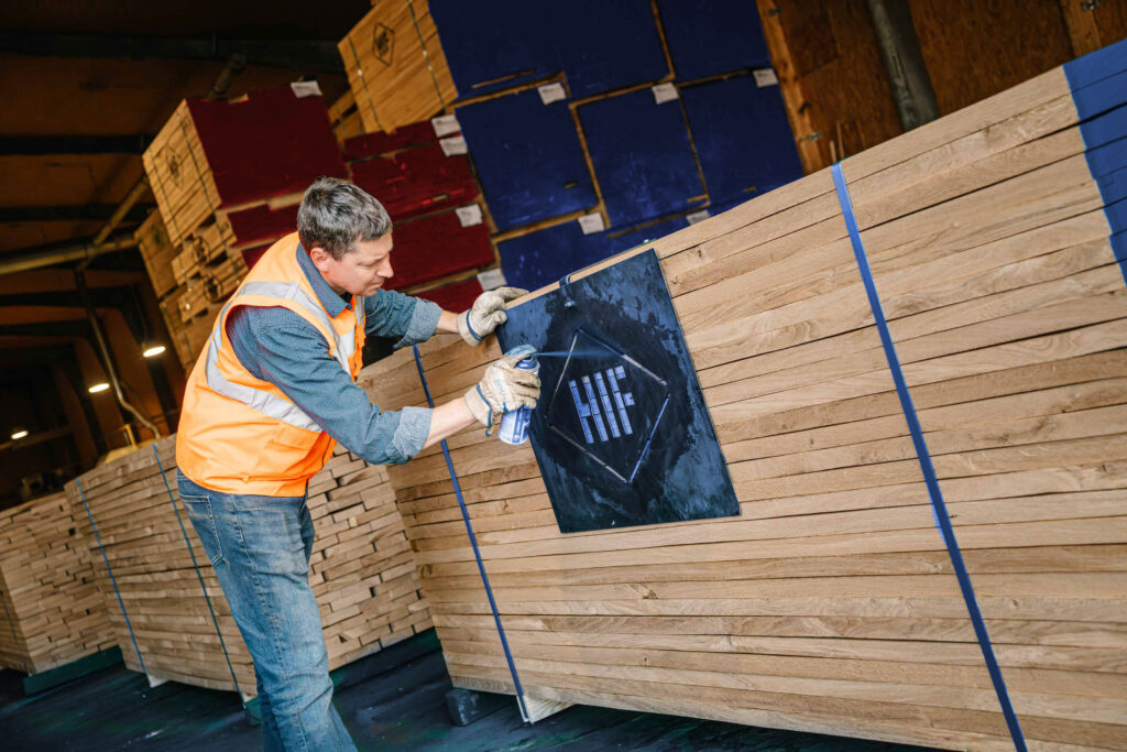 Sehr sorgfältig prüfen unsere Mitarbeiter die Qualität der fertig zugeschnittenen Hölzer. AA, A1F, Cabinet, Rustikal I oder II oder doch Antik? In Sekundenschnelle können entsprechende Merkmale erkannt und sortiert werden. Dieser persönliche Einsatz gibt unseren Kunden die Sicherheit, dass die gewünschte Sortierung das Qualitätsversprechen hält. Unser Logo in unterschiedlichen Farben erleichtert die Zuordnung in der Versandhalle.